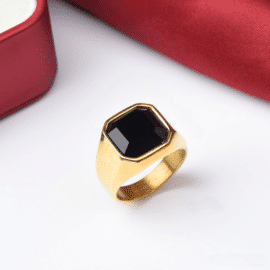 Plongez dans un monde d’élégance intemporelle avec notre magnifique bague dorée ornée d’une pierre d’Onyx en acier inoxydable. Cette bague pierre naturelle incarne à la fois la force de l’acier et la beauté envoûtante de la pierre d’Onyx. Le contraste entre le métal doré et le noir profond crée un équilibre visuel saisissant.