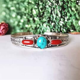 Les véritables pierres de turquoise, avec leurs nuances de bleu vif, confèrent à ce bijou une touche d’authenticité et de caractère.