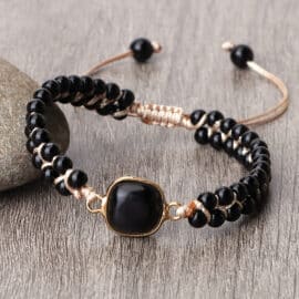 Le bracelet en perles d’onyx noires offre une brillance audacieuse qui ne passe pas inaperçue. Chaque perle noire, lustrée et chatoyante, crée un effet visuel saisissant. La pierre carrée au centre ajoute une dimension unique à ce bijou.