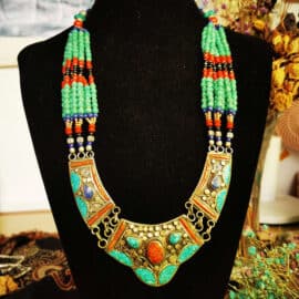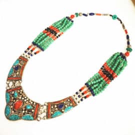 Plongez dans l’univers fascinant de l’artisanat traditionnel avec le collier tibétain vintage en cuivre et pierres naturelles.